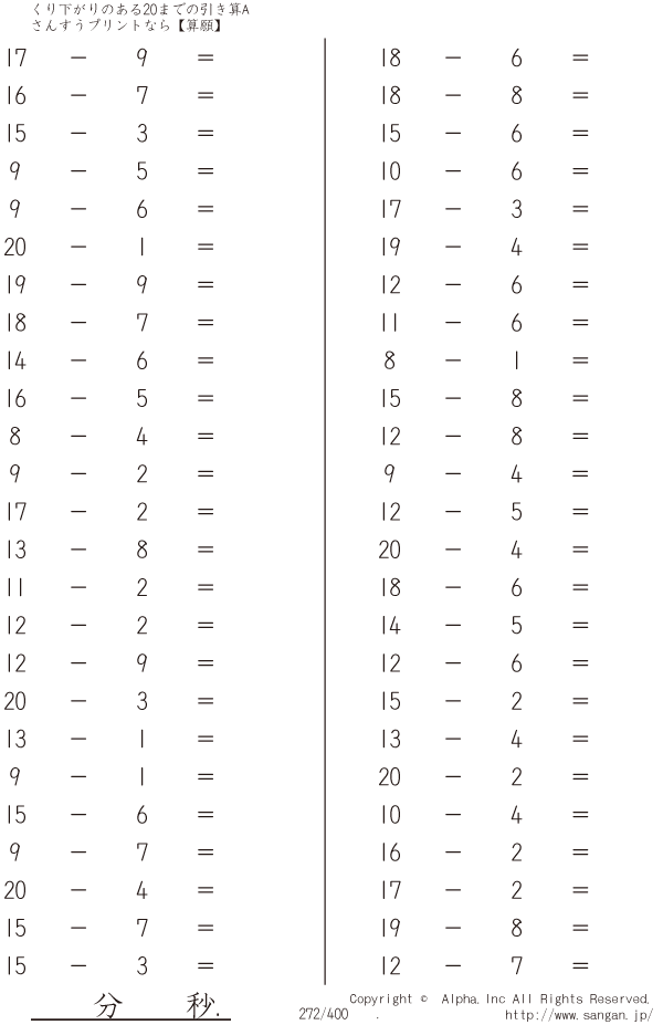 上記のボタンから「くり下がりのある20までの引き算A(1桁で引く)」の算数数学ドリル・計算ドリル(PDFプリント)がダウンロードできます。個人利用は無料です(家庭以外での配布は有料です)。