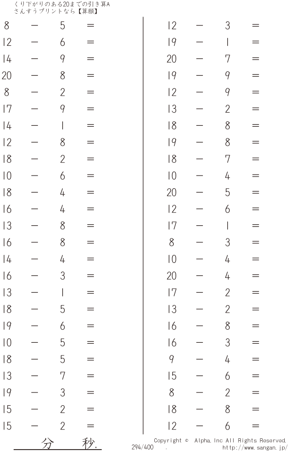 上記のボタンから「くり下がりのある20までの引き算A(1桁で引く)」の算数数学ドリル・計算ドリル(PDFプリント)がダウンロードできます。個人利用は無料です(家庭以外での配布は有料です)。