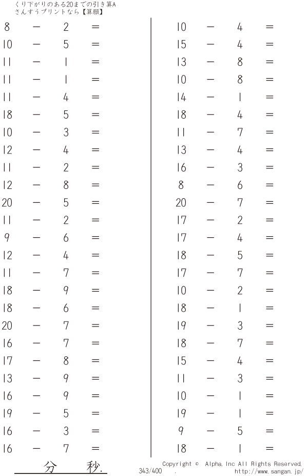 上記のボタンから「くり下がりのある20までの引き算A(1桁で引く)」の算数数学ドリル・計算ドリル(PDFプリント)がダウンロードできます。個人利用は無料です(家庭以外での配布は有料です)。