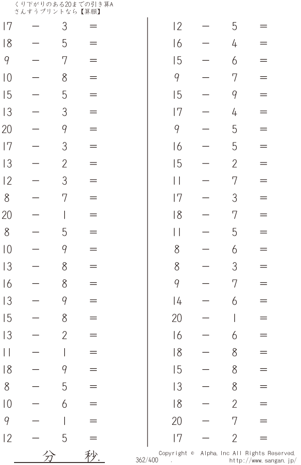 上記のボタンから「くり下がりのある20までの引き算A(1桁で引く)」の算数数学ドリル・計算ドリル(PDFプリント)がダウンロードできます。個人利用は無料です(家庭以外での配布は有料です)。