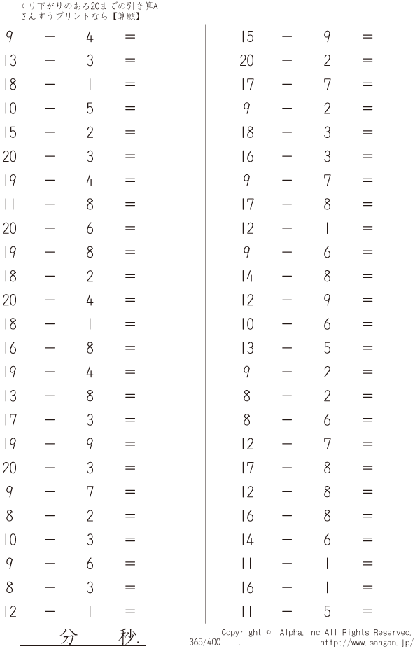 上記のボタンから「くり下がりのある20までの引き算A(1桁で引く)」の算数数学ドリル・計算ドリル(PDFプリント)がダウンロードできます。個人利用は無料です(家庭以外での配布は有料です)。