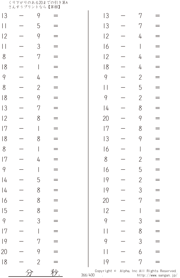 上記のボタンから「くり下がりのある20までの引き算A(1桁で引く)」の算数数学ドリル・計算ドリル(PDFプリント)がダウンロードできます。個人利用は無料です(家庭以外での配布は有料です)。