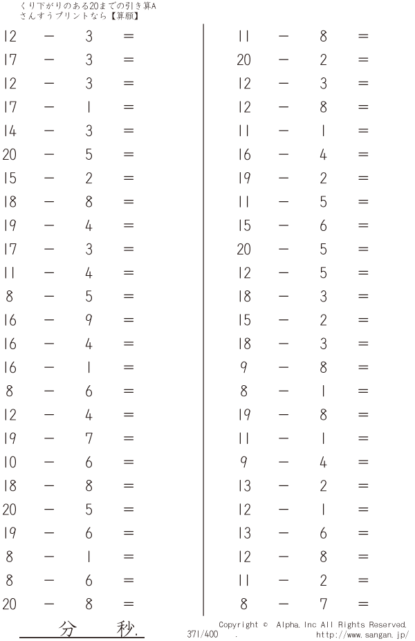 上記のボタンから「くり下がりのある20までの引き算A(1桁で引く)」の算数数学ドリル・計算ドリル(PDFプリント)がダウンロードできます。個人利用は無料です(家庭以外での配布は有料です)。