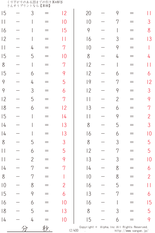くり下がりのある20までの引き算A(1桁で引く) [解答]012/400