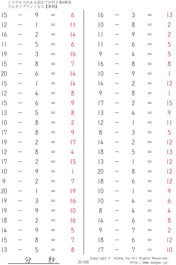 くり下がりのある20までの引き算A(1桁で引く) [解答]020/400