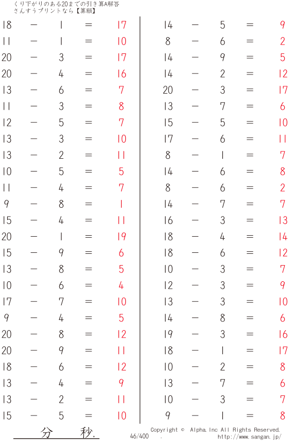 くり下がりのある20までの引き算A(1桁で引く) [解答]046/400