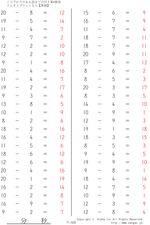 くり下がりのある20までの引き算A(1桁で引く) [解答]071/400