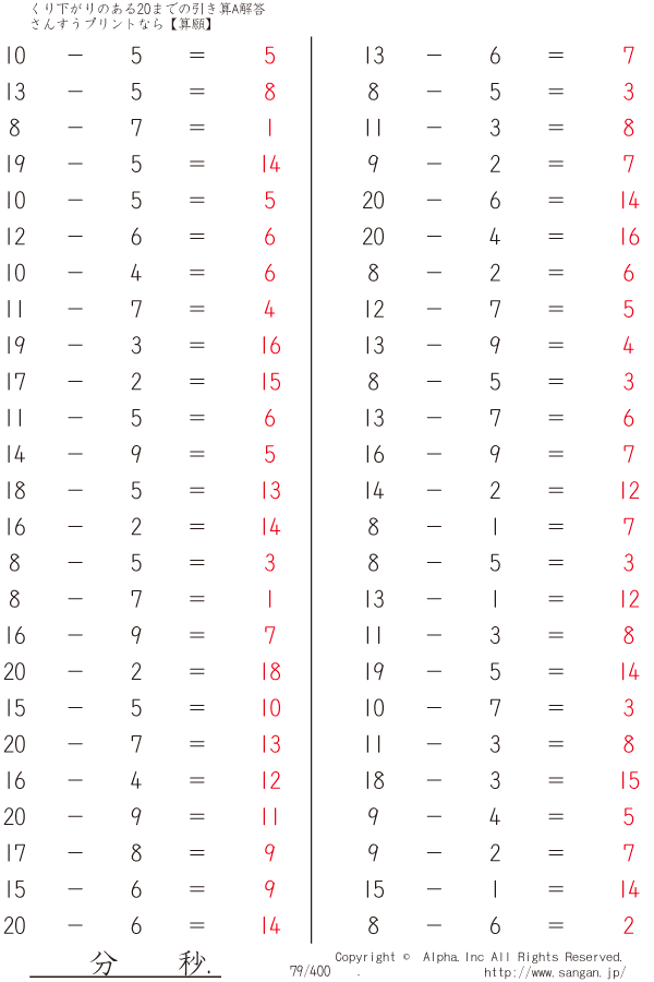 くり下がりのある20までの引き算A(1桁で引く) [解答]079/400