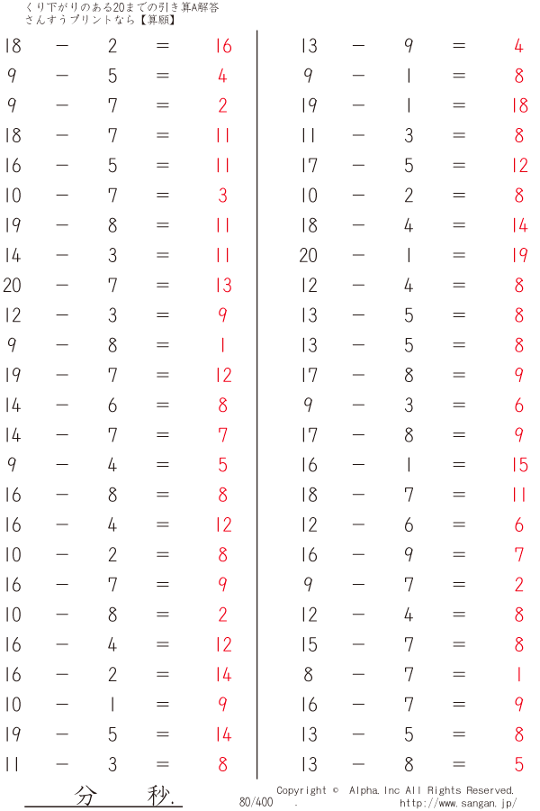 くり下がりのある20までの引き算A(1桁で引く) [解答]080/400