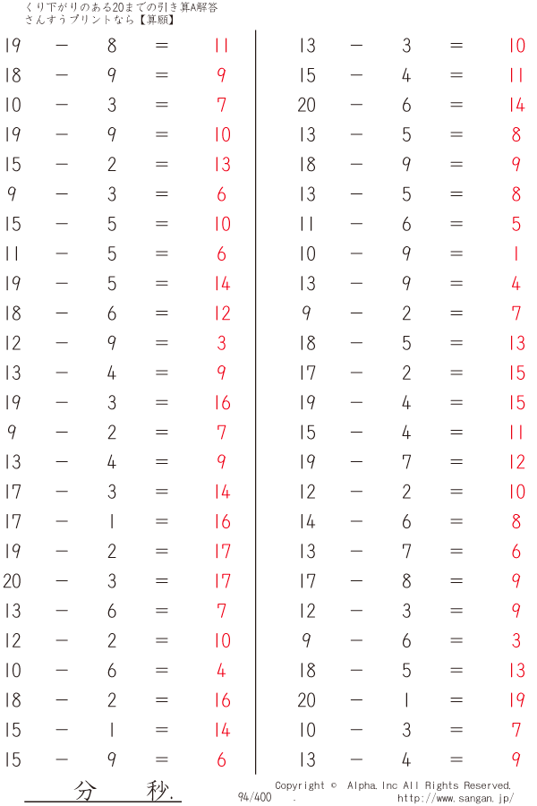 くり下がりのある20までの引き算A(1桁で引く) [解答]094/400