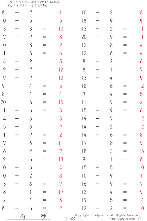 くり下がりのある20までの引き算A(1桁で引く) [解答]111/400