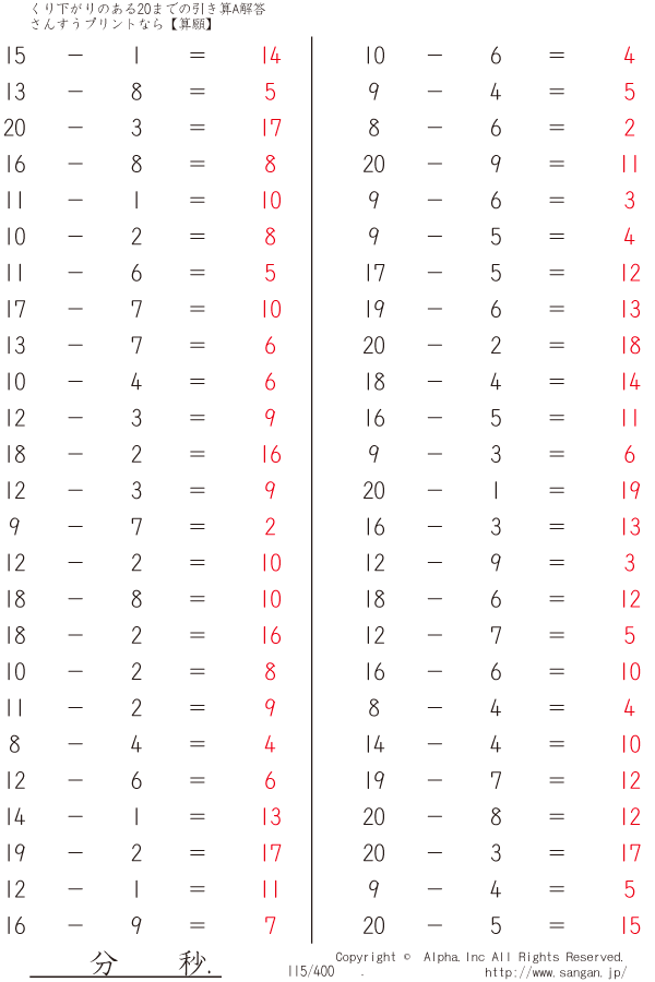 くり下がりのある20までの引き算A(1桁で引く) [解答]115/400