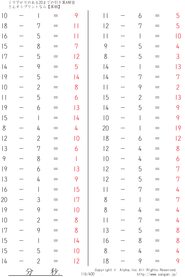 くり下がりのある20までの引き算A(1桁で引く) [解答]116/400