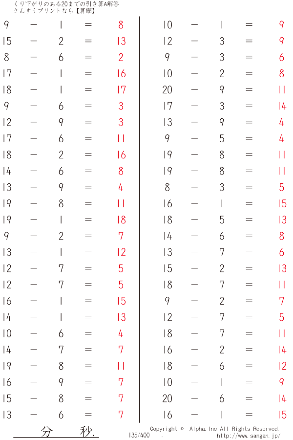くり下がりのある20までの引き算A(1桁で引く) [解答]135/400