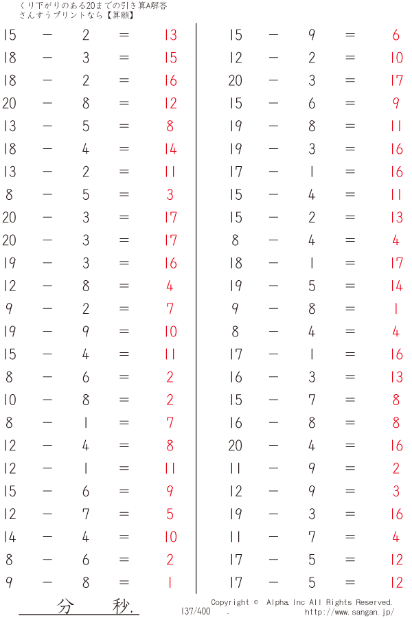 くり下がりのある20までの引き算A(1桁で引く) [解答]137/400