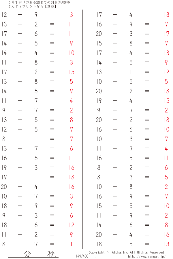 くり下がりのある20までの引き算A(1桁で引く) [解答]149/400