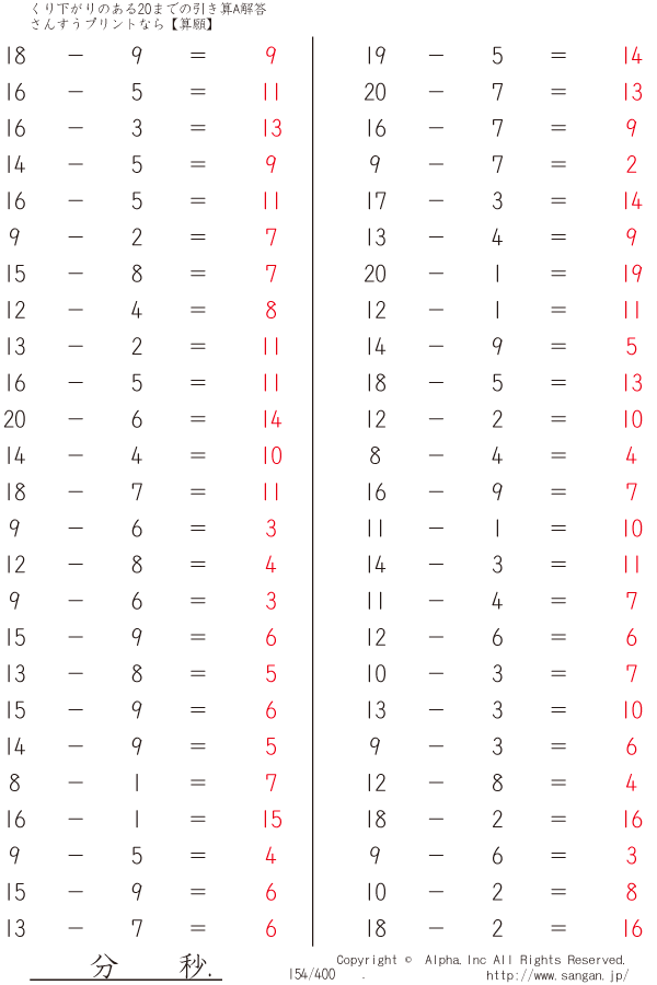 くり下がりのある20までの引き算A(1桁で引く) [解答]154/400