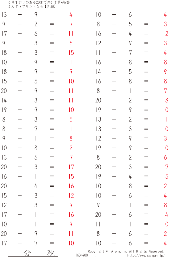 くり下がりのある20までの引き算A(1桁で引く) [解答]163/400