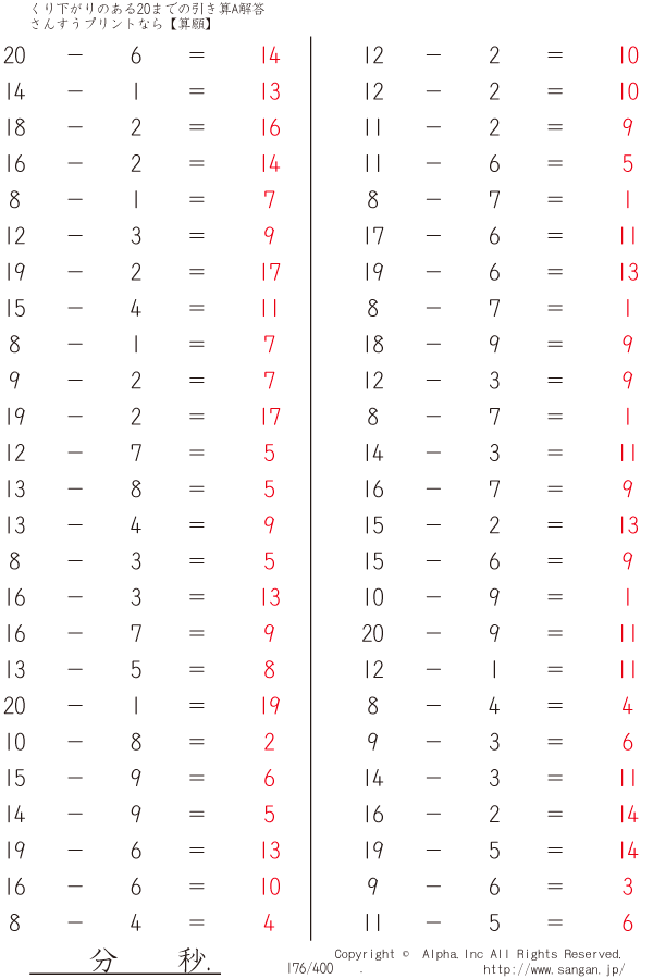 くり下がりのある20までの引き算A(1桁で引く) [解答]176/400