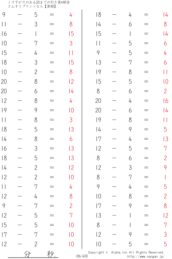くり下がりのある20までの引き算A(1桁で引く) [解答]186/400