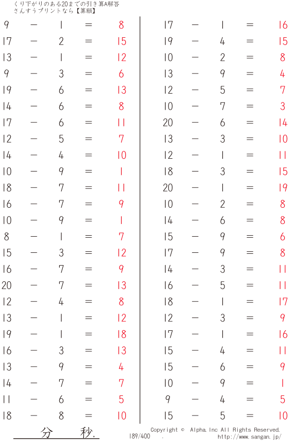 くり下がりのある20までの引き算A(1桁で引く) [解答]189/400