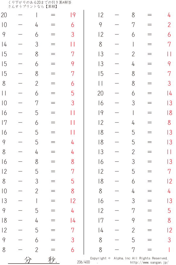 くり下がりのある20までの引き算A(1桁で引く) [解答]206/400
