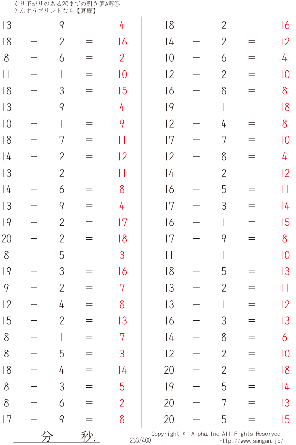 くり下がりのある20までの引き算A(1桁で引く) [解答]233/400