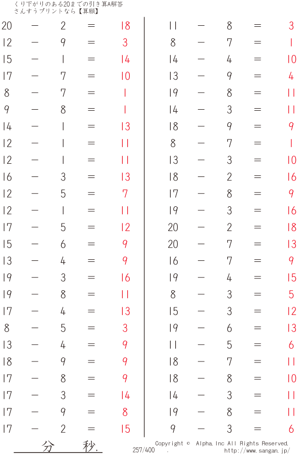 くり下がりのある20までの引き算A(1桁で引く) [解答]257/400