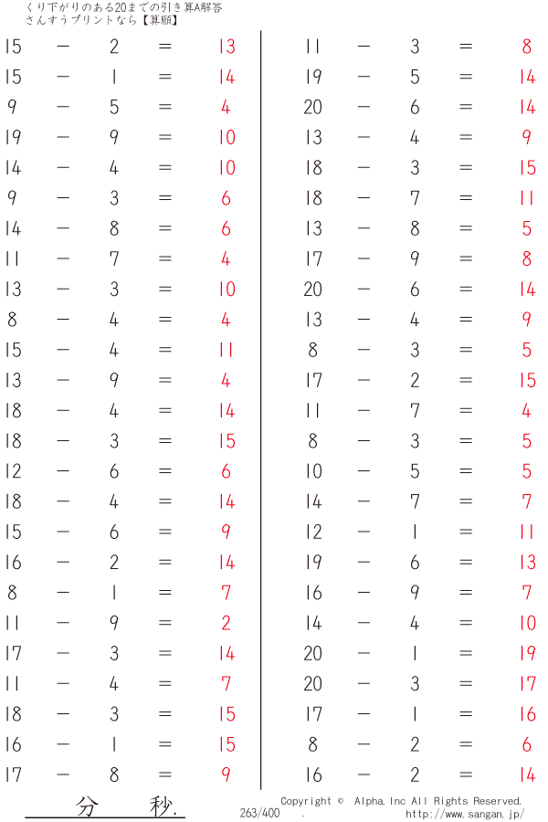くり下がりのある20までの引き算A(1桁で引く) [解答]263/400