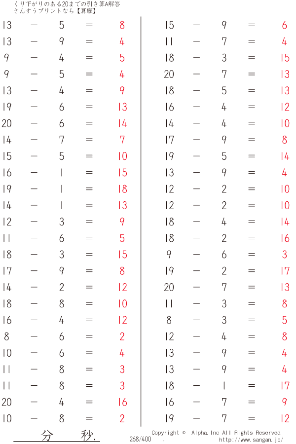 くり下がりのある20までの引き算A(1桁で引く) [解答]268/400