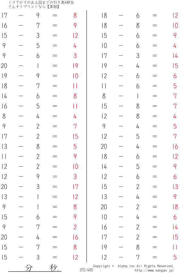 くり下がりのある20までの引き算A(1桁で引く) [解答]272/400