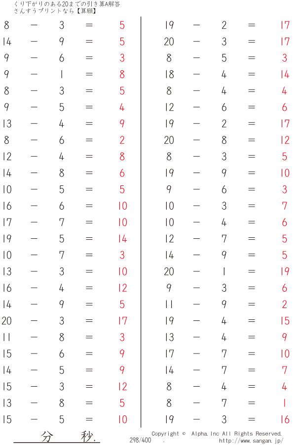 くり下がりのある20までの引き算A(1桁で引く) [解答]298/400