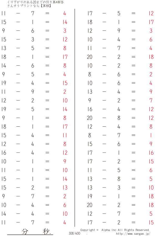 くり下がりのある20までの引き算A(1桁で引く) [解答]308/400