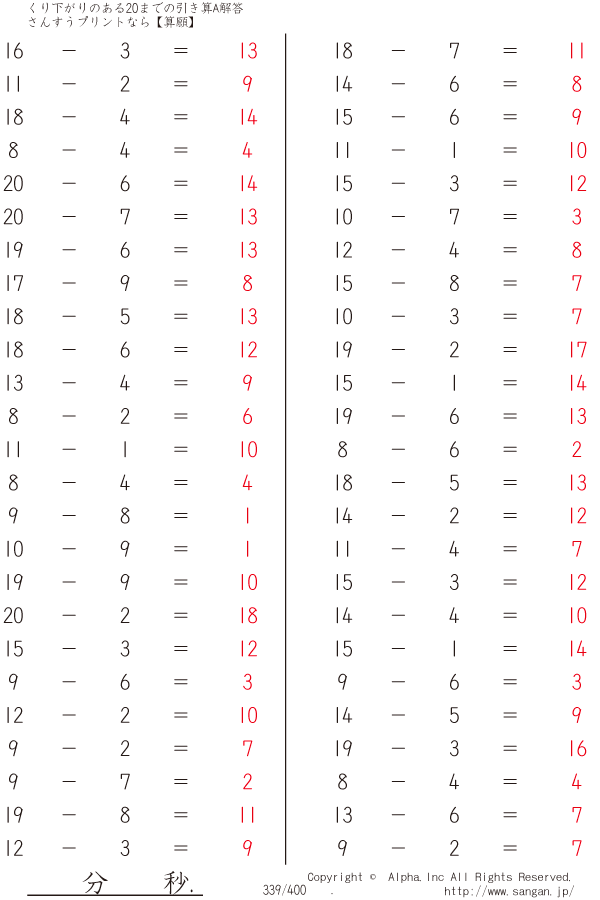 くり下がりのある20までの引き算A(1桁で引く) [解答]339/400