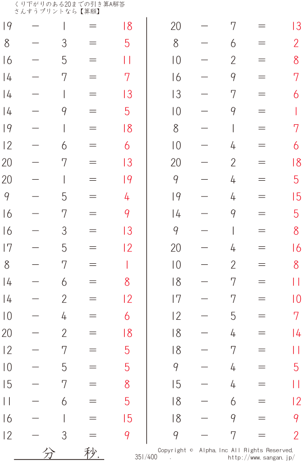 くり下がりのある20までの引き算A(1桁で引く) [解答]351/400