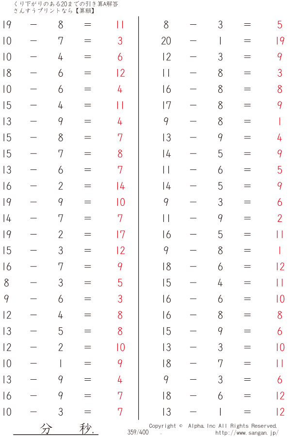 くり下がりのある20までの引き算A(1桁で引く) [解答]359/400