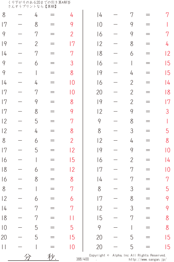 くり下がりのある20までの引き算A(1桁で引く) [解答]388/400