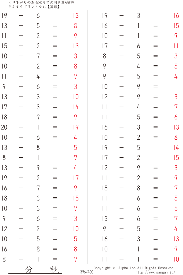 くり下がりのある20までの引き算A(1桁で引く) [解答]396/400