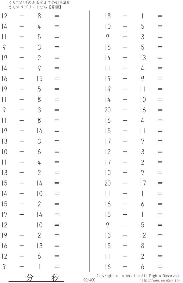 上記のボタンから「くり下がりのある20までの引き算B(2桁で引く)」の算数数学ドリル・計算ドリル(PDFプリント)がダウンロードできます。個人利用は無料です(家庭以外での配布は有料です)。