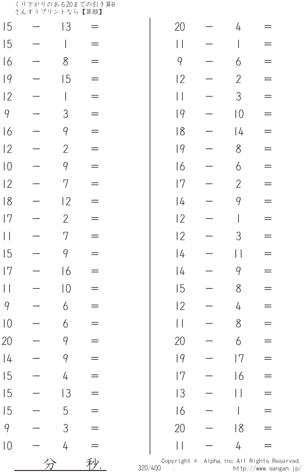 くり下がりのある20までの引き算B(2桁で引く) [問題]320/400