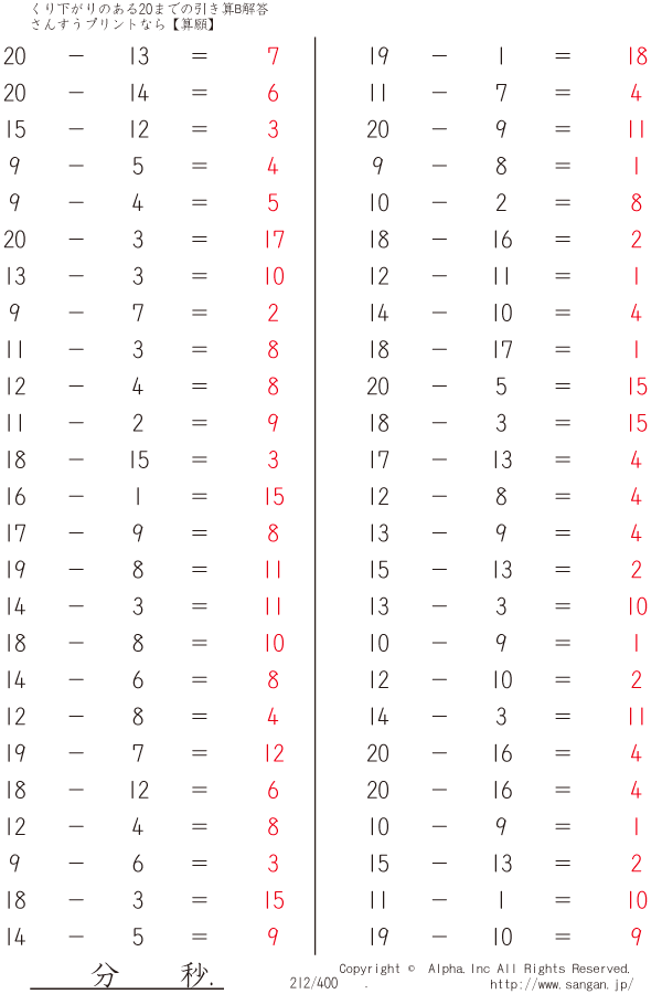 くり下がりのある20までの引き算B(2桁で引く) [解答]212/400