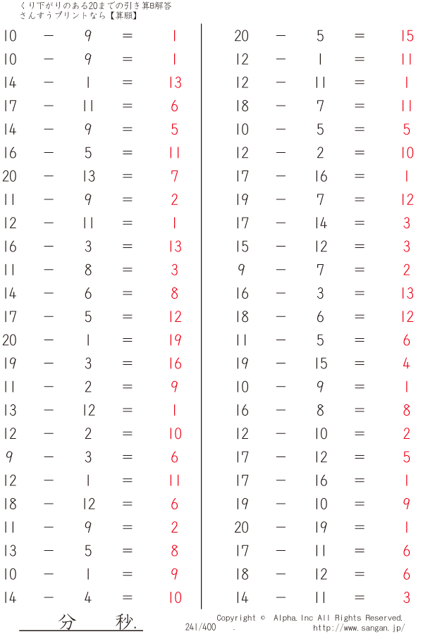 くり下がりのある20までの引き算B(2桁で引く) [解答]241/400