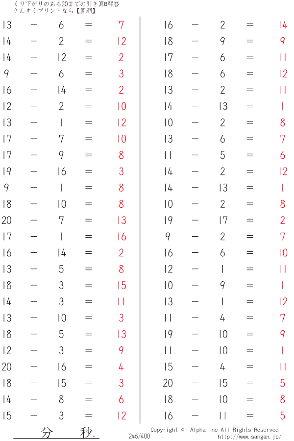 くり下がりのある20までの引き算B(2桁で引く) [解答]246/400