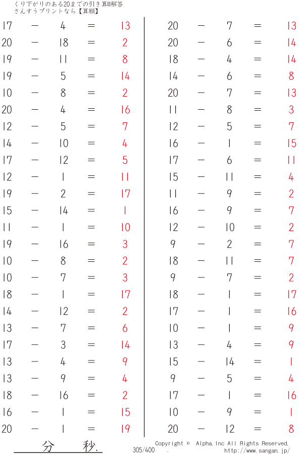 くり下がりのある20までの引き算B(2桁で引く) [解答]305/400