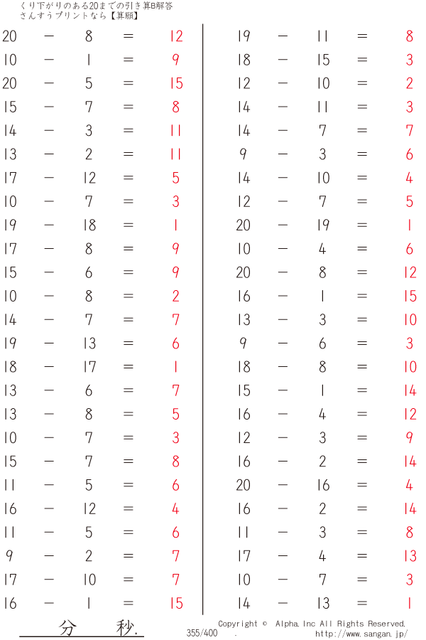 くり下がりのある20までの引き算B(2桁で引く) [解答]355/400