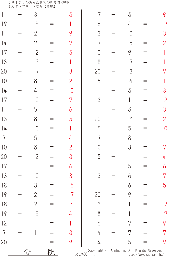 くり下がりのある20までの引き算B(2桁で引く) [解答]365/400