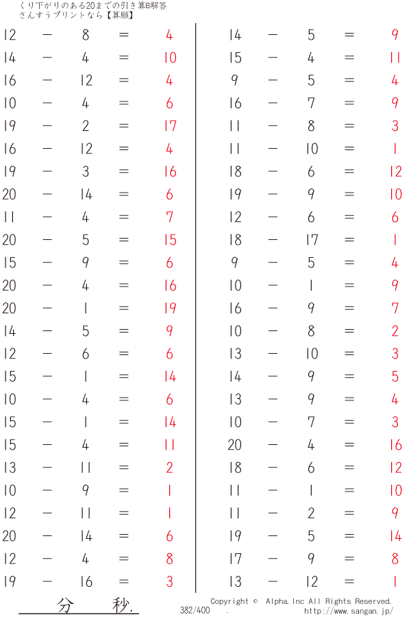 くり下がりのある20までの引き算B(2桁で引く) [解答]382/400