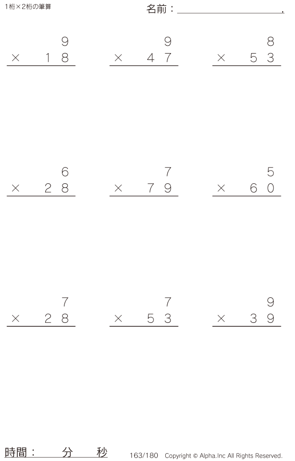 上記のボタンから「1桁×2桁の筆算」の算数数学ドリル・計算ドリル(PDFプリント)がダウンロードできます。個人利用は無料です(家庭以外での配布は有料です)。