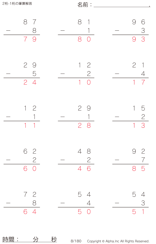 上記のボタンから「2桁-1桁の筆算」の算数数学ドリル・計算ドリル(PDFプリント)がダウンロードできます。個人利用は無料です(家庭以外での配布は有料です)。