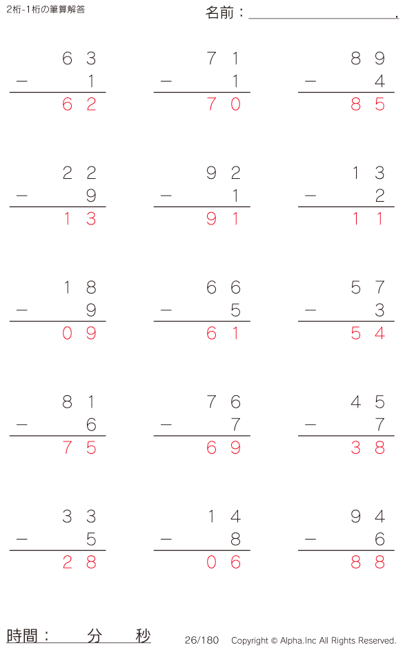 2桁-1桁の筆算 [解答]026/180